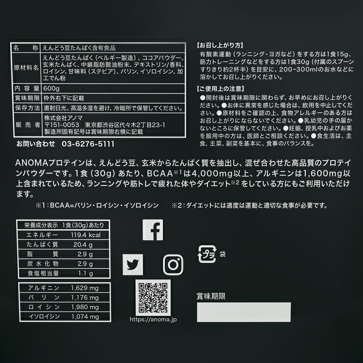 原材料 えんどう豆たんぱく(ベルギー製造)、ココアパウダー、玄米たんぱく、 中鎖脂肪酸油粉末、デキストリン/香料、ロイシン、甘味料(ステビア)、 バリン、イソロイシン、加工でん粉 使用方法 有酸素運動(ランニング・ヨガなど)をする方は1食15g、 筋力トレーニングなどをする方は1食30g(付属のスプーンすりきり約2杯半)を 目安に、200〜300mlのお水や豆乳などに溶かしてお召し上がりください。