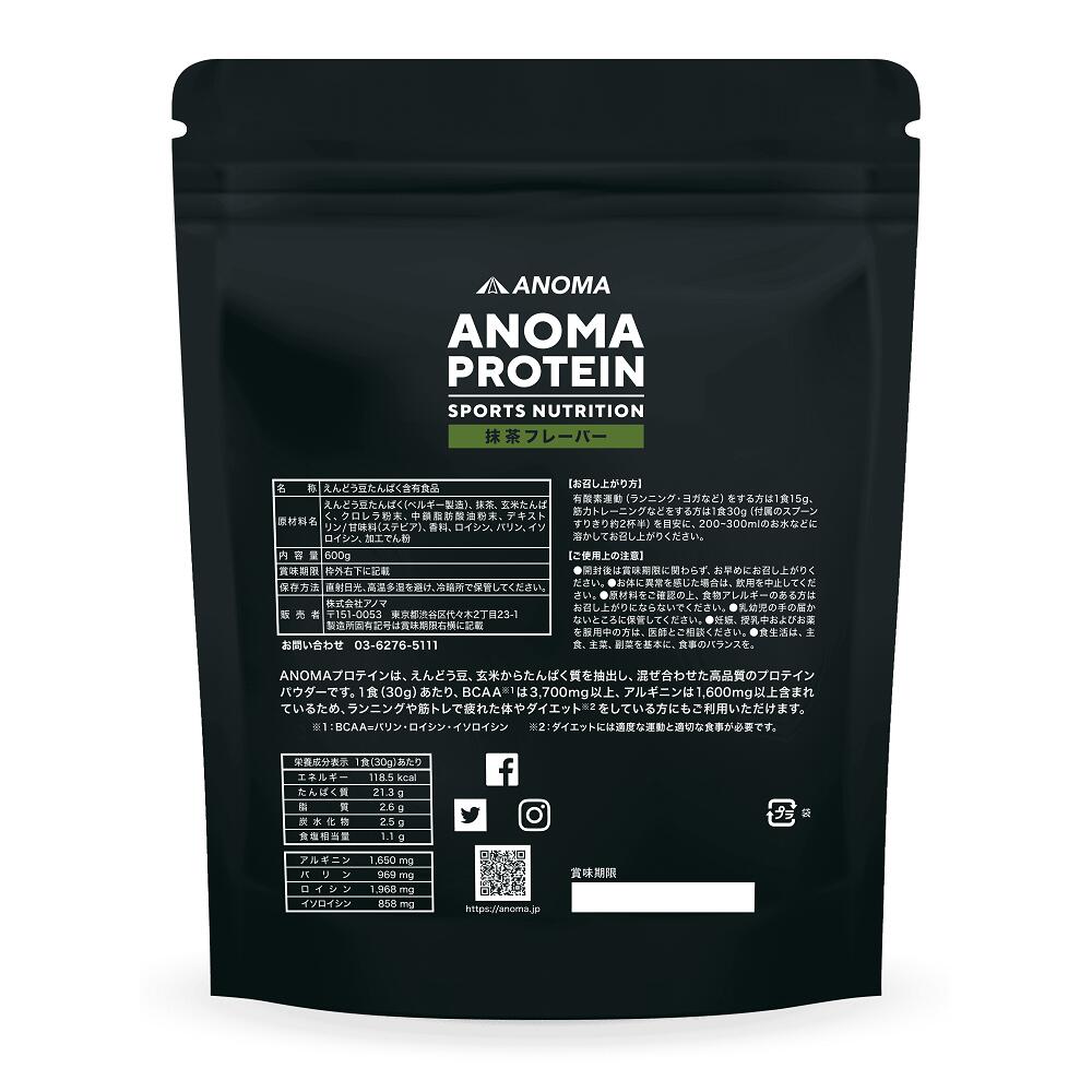 ・広告文責:株式会社アノマ・03-6276-5111 ・メーカー:株式会社アノマ ・生産国:日本 ・商品区分:健康食品 ・名称:ANOMAプロテイン ・原材料名:えんどう豆たんぱく、ココアパウダー、玄米たんぱく、中鎖脂肪酸粉末(MCTオイル)、デキストリン、香料、ロイシン、甘味料(ステビア)、バリン、イソロイシン、加工でん粉 ・内容量:600g ・賞味期限:パッケージに記載 ・保存方法:直射日光、高温多湿を避け、冷暗所で保管してください。