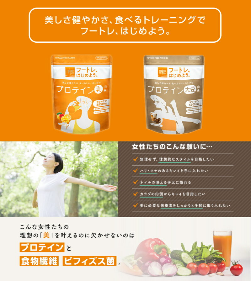 商品説明 販売元 株式会社ティップネス 商品説明 名称:プロテインパウダー(カフェオレ味) 内容量:390g 原材料名:イヌリン(ベルギー製造)、大豆タンパク(遺伝子組み換えでない)、コラーゲンペプチド(豚肉を含む)、クリーミングパウダー(デキストリン、植物油脂、乳糖、脱脂粉乳)、脱脂粉乳、コーヒー、砂糖、デキストリン、ビフィズス菌乾燥粉末(澱粉、ビフィズス菌乾燥原末)/V.C、カゼインNa、pH調整剤、乳化剤、クエン酸鉄アンモニウム、香料、甘味料(スクラロース、ネオテーム)、ナイアシン、パントテン酸Ca、V.B1、V.B6、V.B2、V.B12 栄養成分表示:1食(26g)あたり エネルギー 89kcal、たんぱく質 11.1g、脂質 0.9g、炭水化物 12.4g、ー糖質 5.7g、ー食物繊維 6.7g、食塩相当量 0.2g、ビタミンC 114mg、ビタミンB1 0.6mg、ビタミンB2 0.6mg、ビタミンB6 0.9mg、ビタミンB12 2.4μg、パントテン酸 2.9mg、ナイアシン 9mg、鉄 4.2mg コラーゲン 5,000mg、ビフィズス菌 40億個 ※生産時 【召し上がり方】 約26g(目安大さじ3杯)を200ccの水または豆乳や牛乳に溶かしてお召し上がりください。